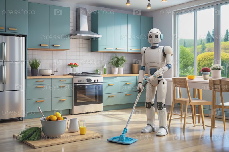 Робот-ассистент убирает современную кухню с мопом. генеративный ИИ