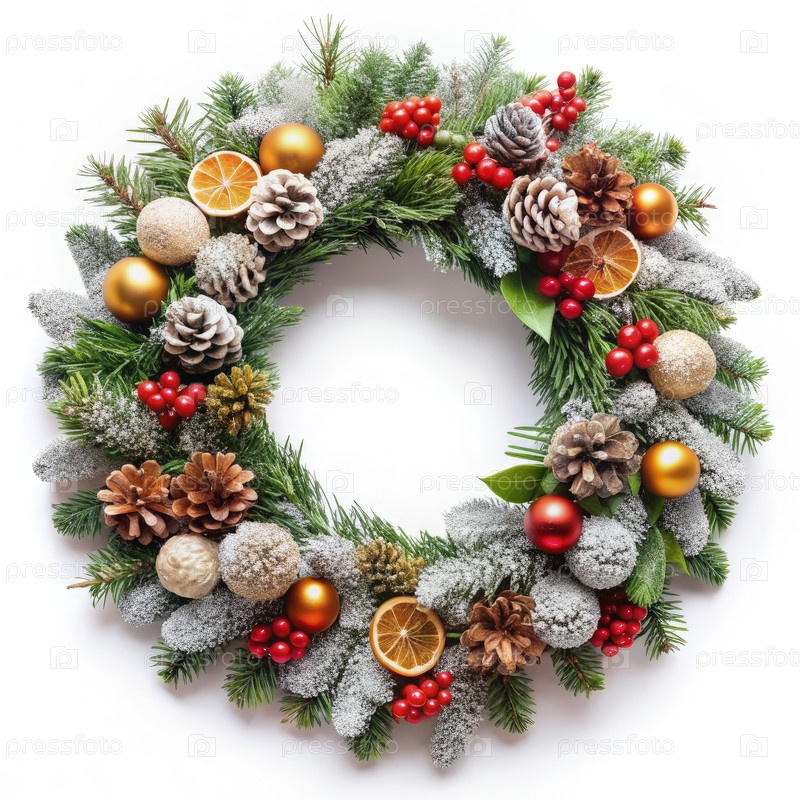 Вечнозеленый рождественский венок с сосновыми конусами, ягодами и сушеными нарезами апельсина