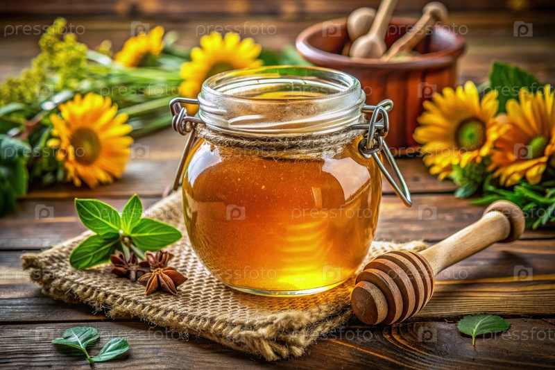 Рустический настольный натюрморт с банкой меда, деревянным диппером и цветами подсолнечника