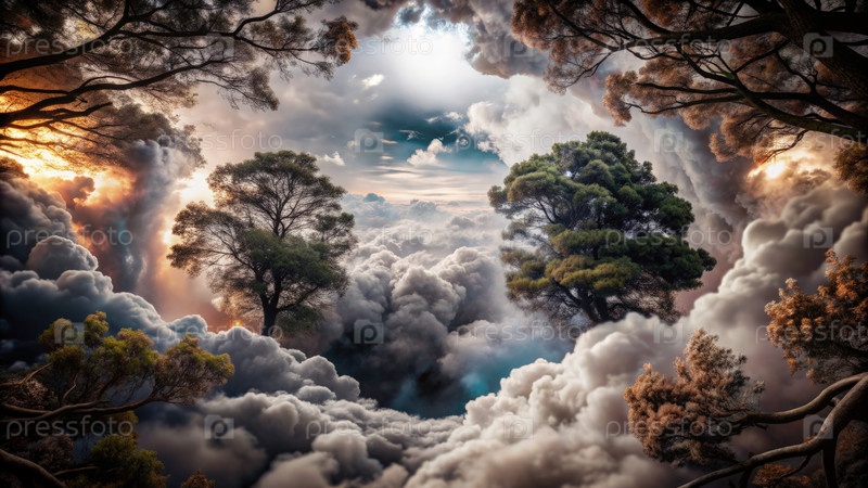 Сюрреалистические деревья, пробивающиеся сквозь облачное небо