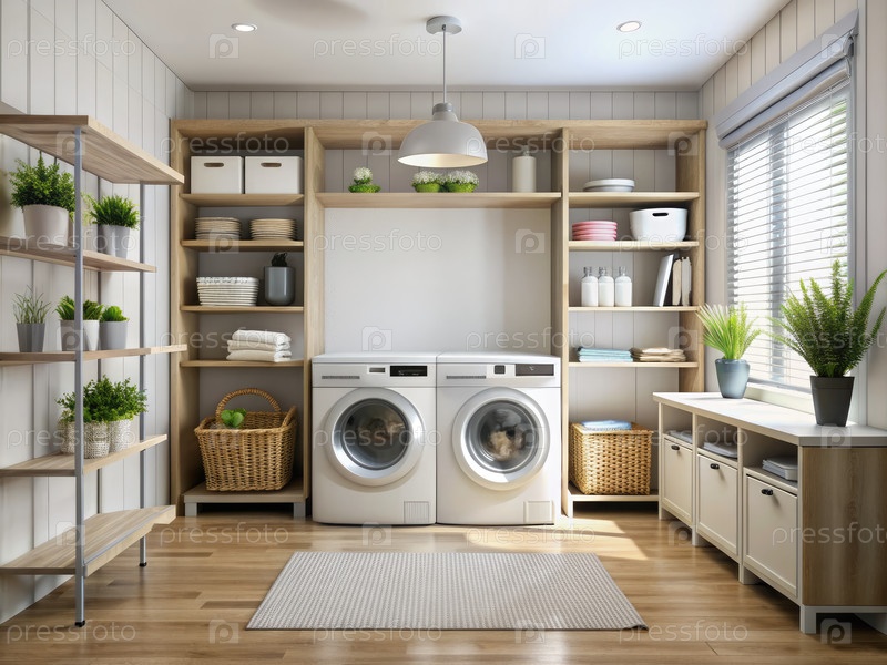 Прачечная с белыми стиральными машинами и деревянными полками. генеративный современный ИИ