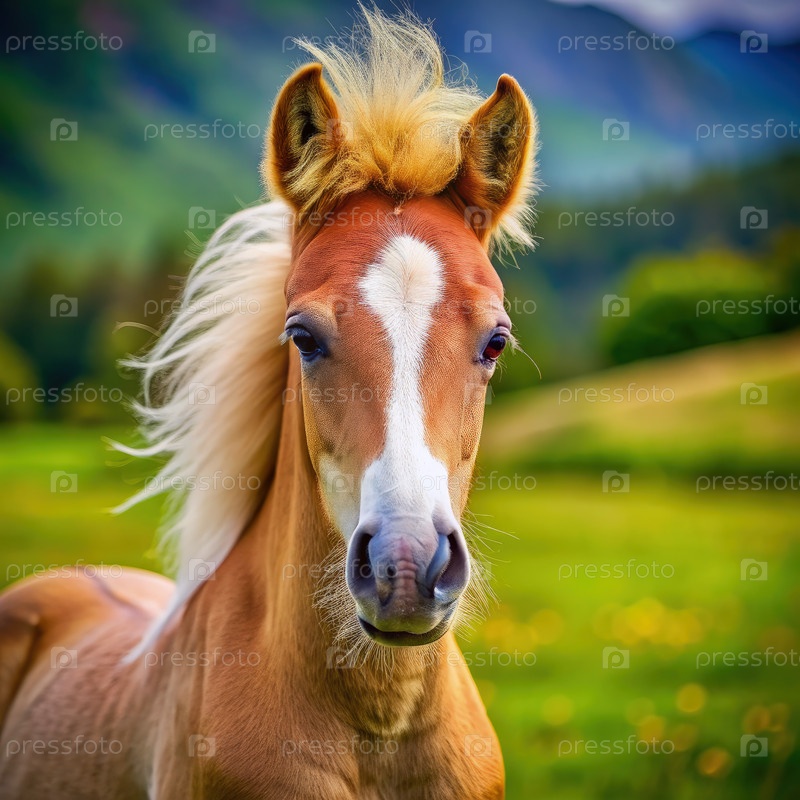 Красивая милая лошадь, стоящая на пышном зеленом поле в яркий солнечный день