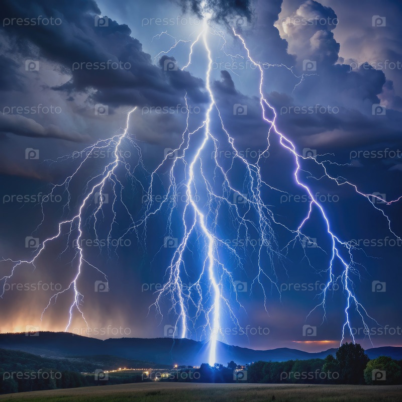 Драматический молниеносный удар по сельскому ландшафту ночью
