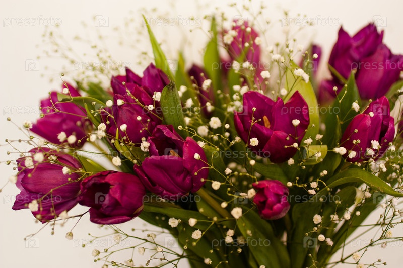 Букет сиреневых тюльпанов с гипсофилой
