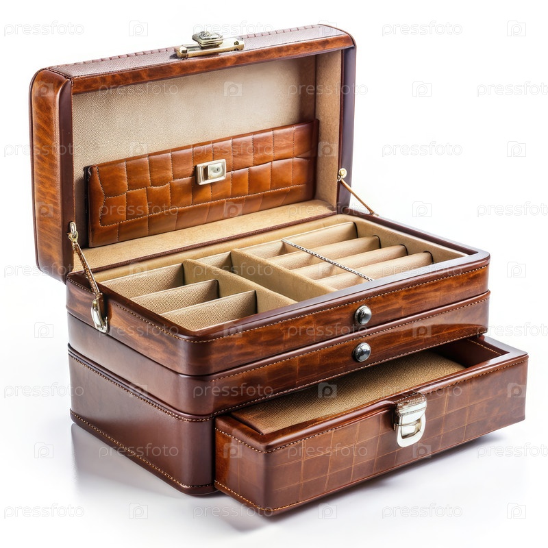 Кожаная ювелирная коробка с тремя ящиками открыта на белом фоне