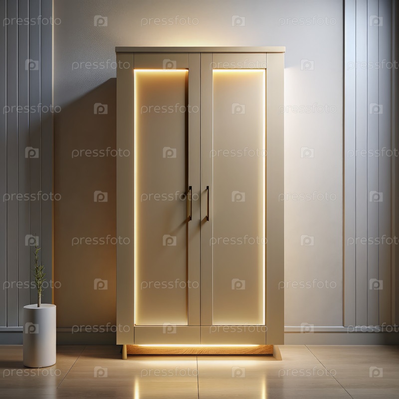 Бежевый шкаф с подсвеченными дверями в минималистическом интерьере