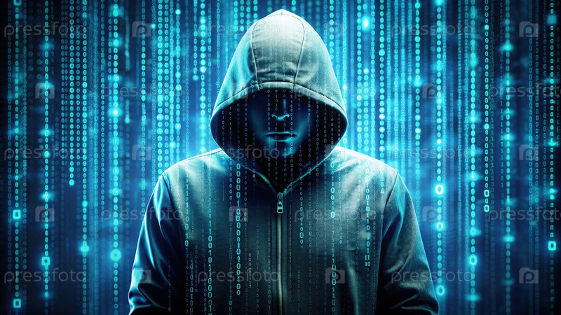 Загадочный хакер, окруженный светящимся бинарным кодом в темной среде ночью