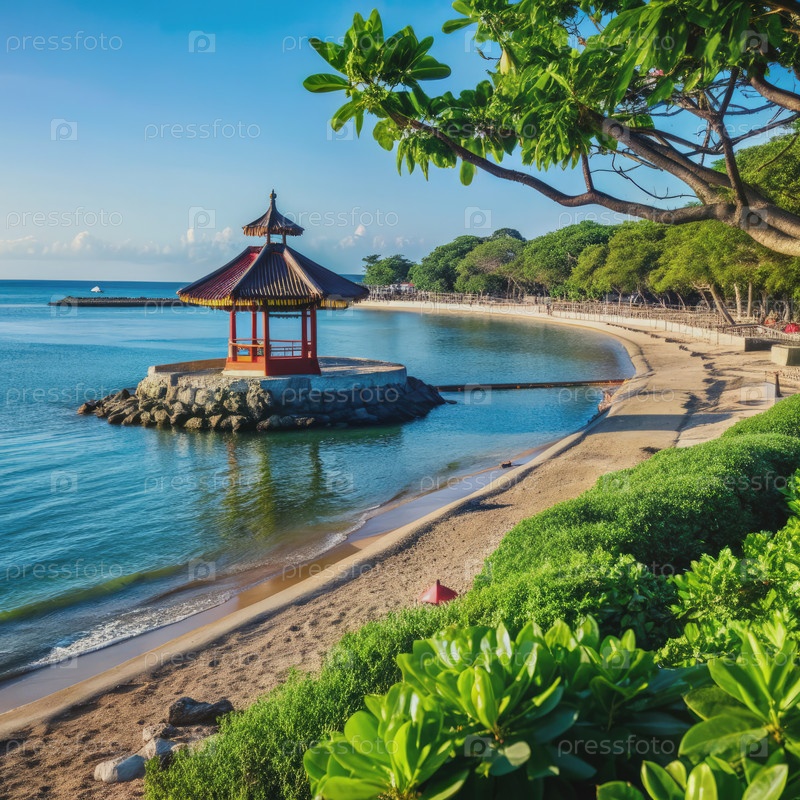 Спокойная беседка на пляже Санур, Бали, с чистой голубой водой и пышной зеленью