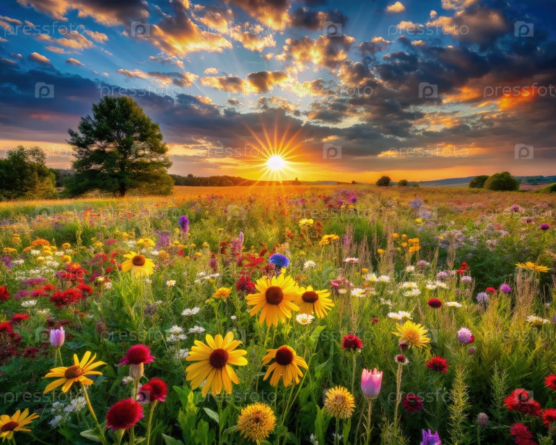 Вибрирующие дикие цветы расцветают на закате в мирной лужайке