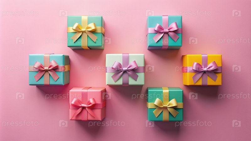 Красочные коробки для подарков расположены на розовой поверхности