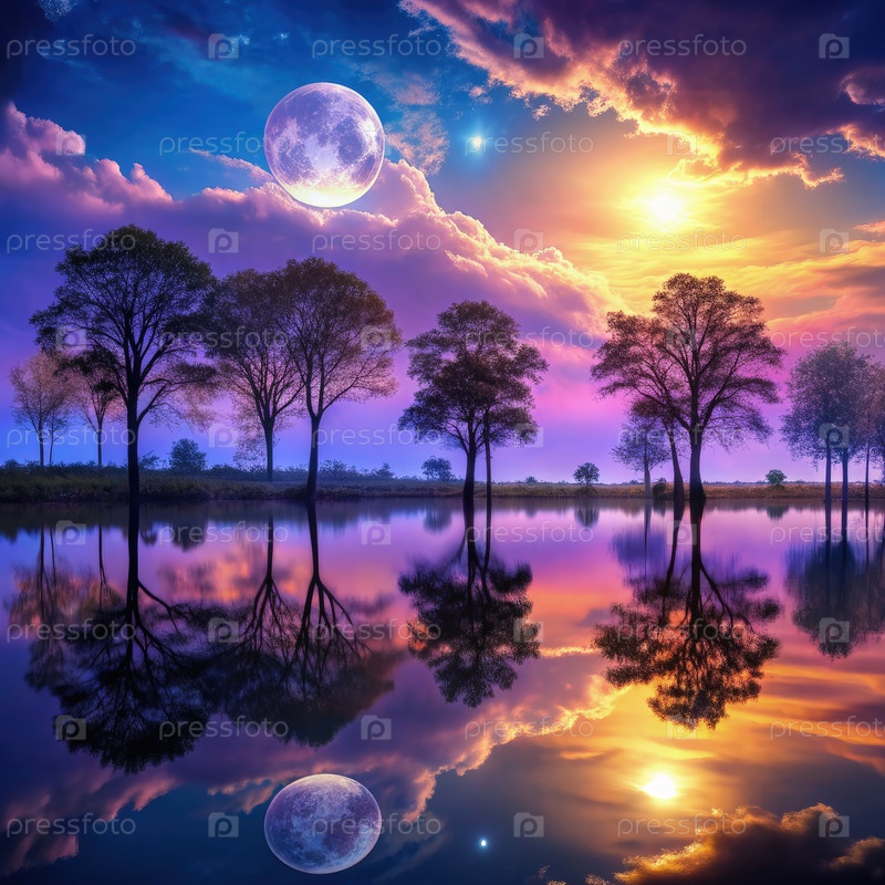 Завораживающее сумерки над тихим озером с силуэтными деревьями и лунным небом