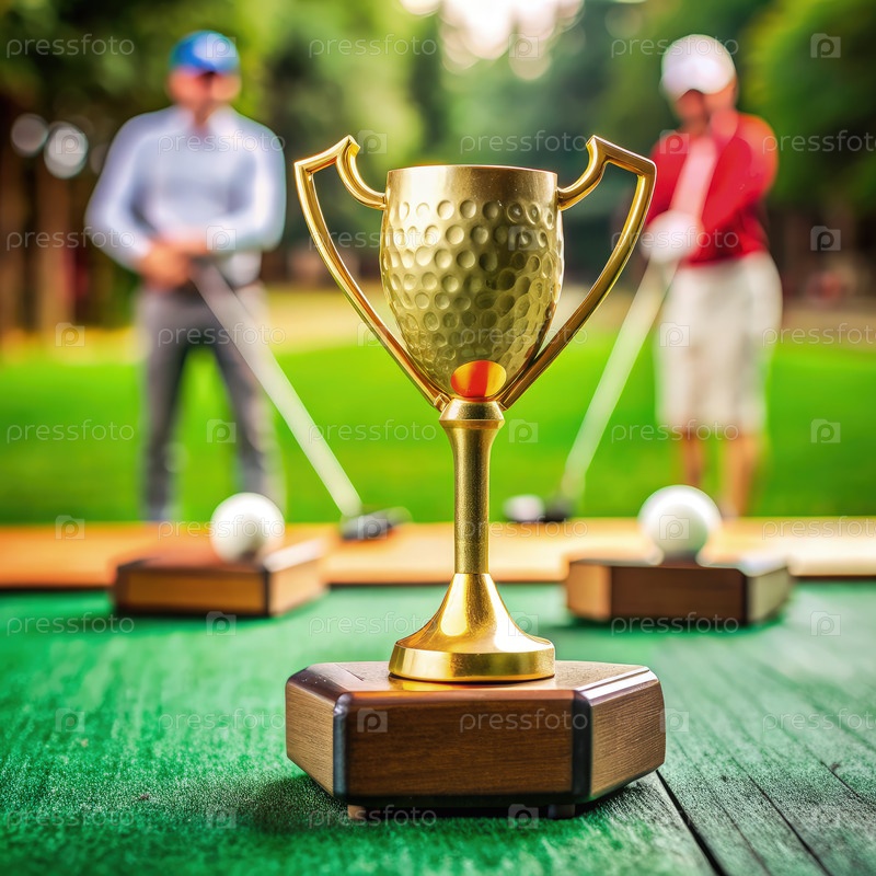 Увлекательный турнир по мини-гольфу с трофеем под ярким солнечным светом в теплый день