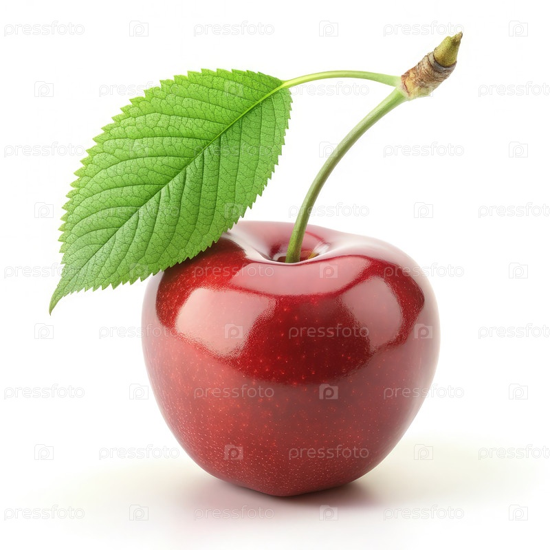 Одинокая красная вишня с листьем на белом фоне