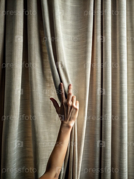 Деликатное ручное разделение кремового цветного штора, чтобы впустить утренний свет. генеративный AI