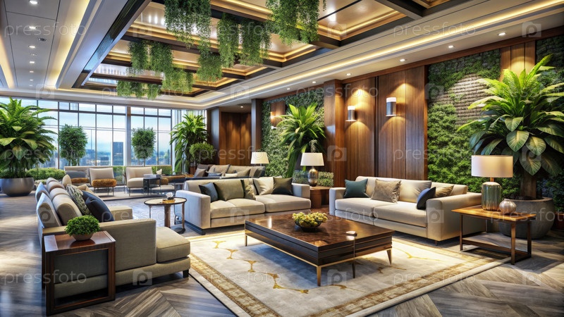 Роскошная большая комната для отдыха с современным дизайном и обильной зеленью в современной офисной обстановке