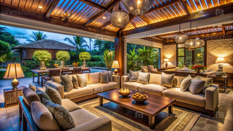Широкоугольный вид балийской гостиной с деревянным потолком и наружным двором