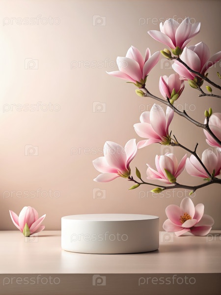Пустой продуктовый подиум с розовыми цветами магнолии на нейтральном фоне