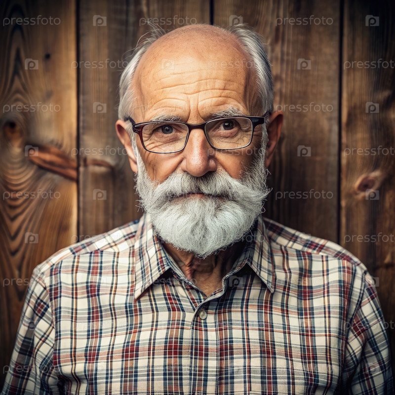 Портрет пожилого человека с очками и бородой на деревянном фоне