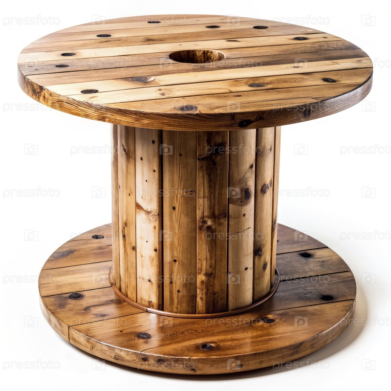 Уникальный стол из деревянного кабельного спила, опирающийся на белый фон с естественной текстурой и дизайном