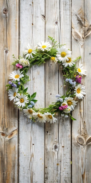 Рустическая белая деревянная стена с венком ромашек и диких цветов