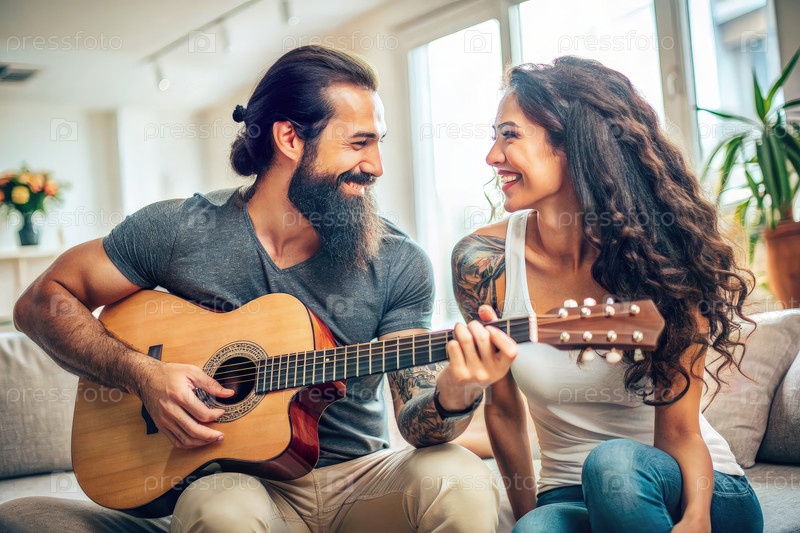 Молодая пара наслаждается музыкальным моментом вместе в уютной гостиной