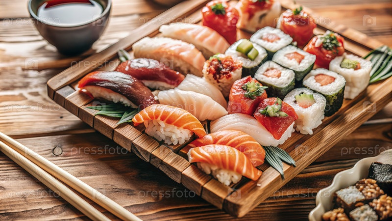 Сортированный набор суши, отображаемый на деревянном столе в окружении палочек и соевого соуса