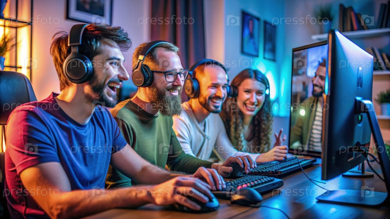 Игроки, участвующие в живом видеочате во время вечерней игровой сессии дома