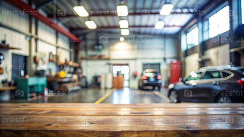 Деревянная столешница с видом на оживленный гараж по ремонту автомобилей