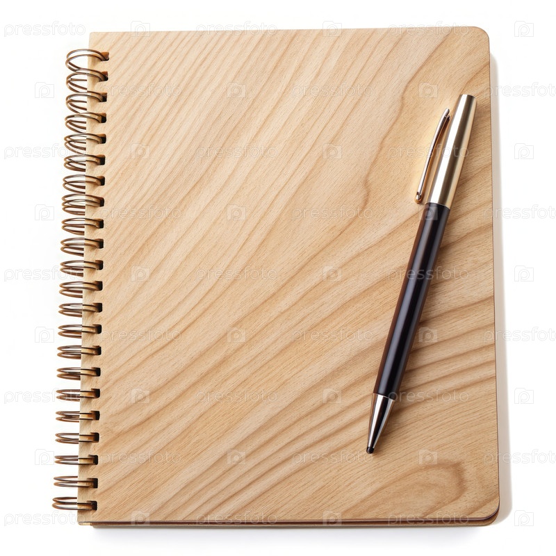 Естественный деревянный блокнот со спиральной связью и элегантной ручкой на простом фоне