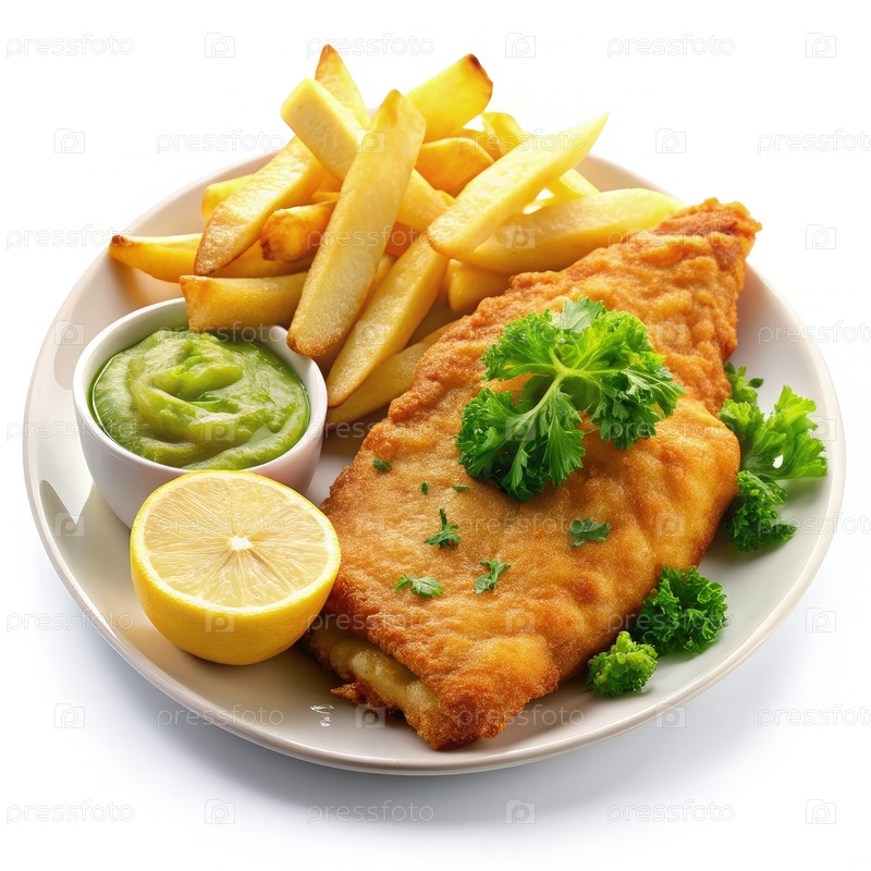 Хрустящая жаренная рыба и чипсы с горохом и лимонным лом. генеративный ИИ