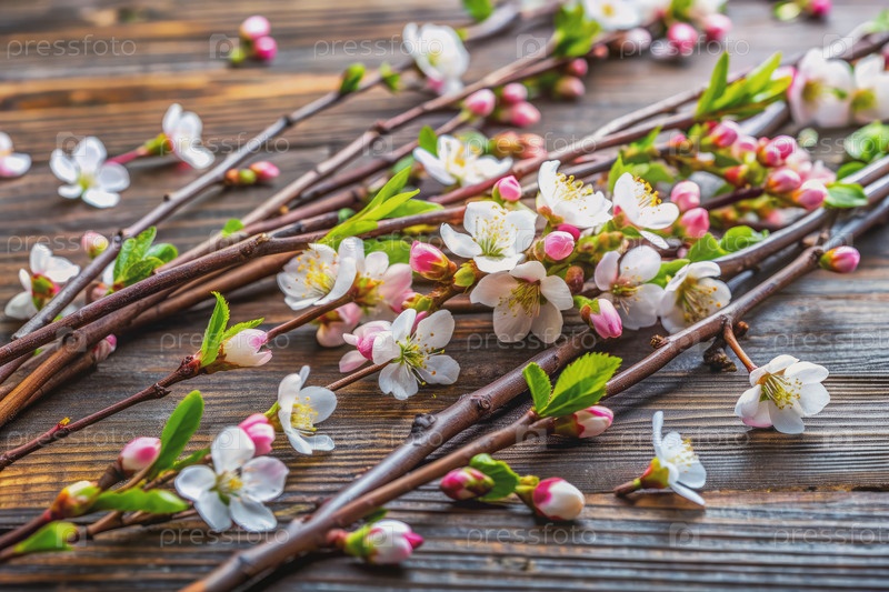 Деликатные белые цветы на голых ветках на деревянном фоне