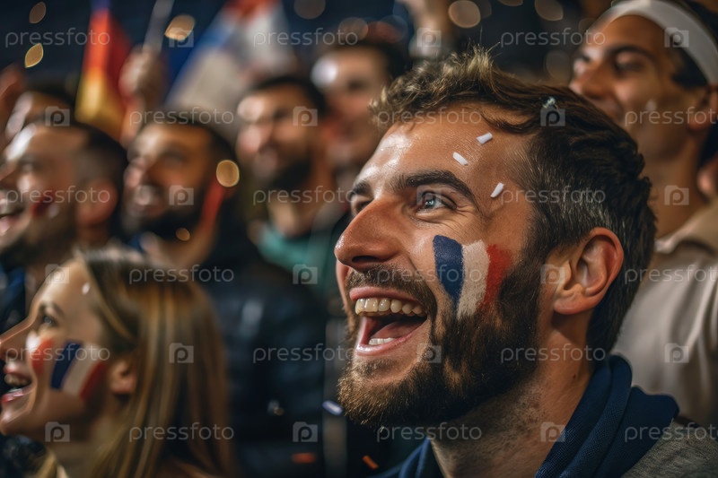 Веселый фанат празднует на региональном мероприятии во Франции во время захватывающей ночи спортивного матча