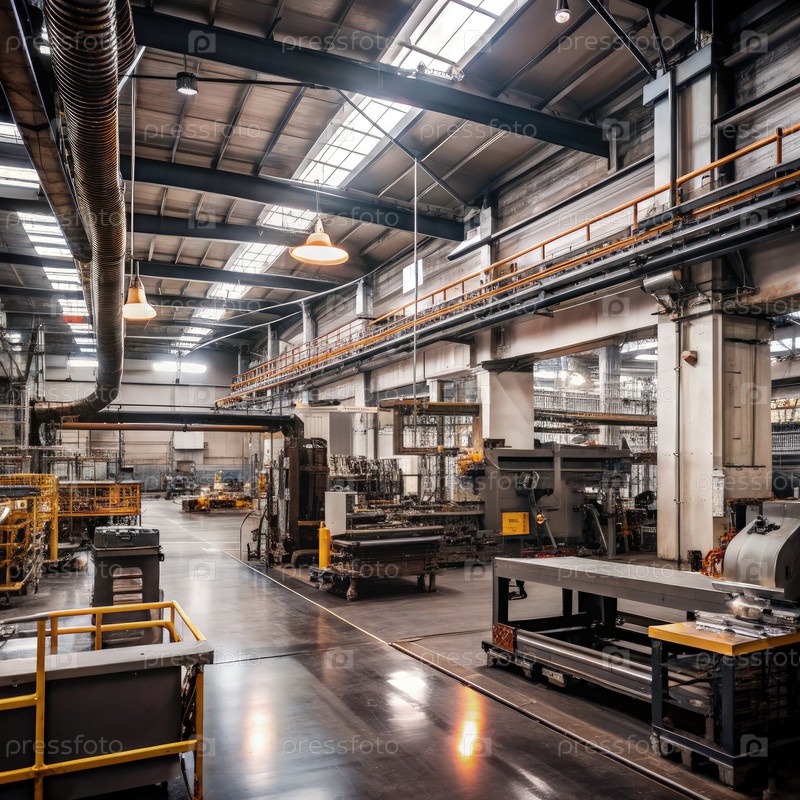 Современный фабричный интерьер с промышленным оборудованием и ярким рабочим пространством во время активных дневных операций