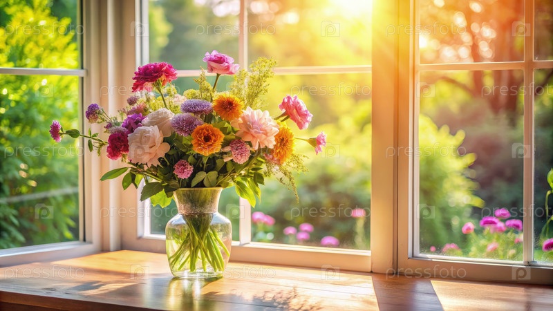Красочный букет цветов в стеклянной вазе на подоконнике с солнечной природой