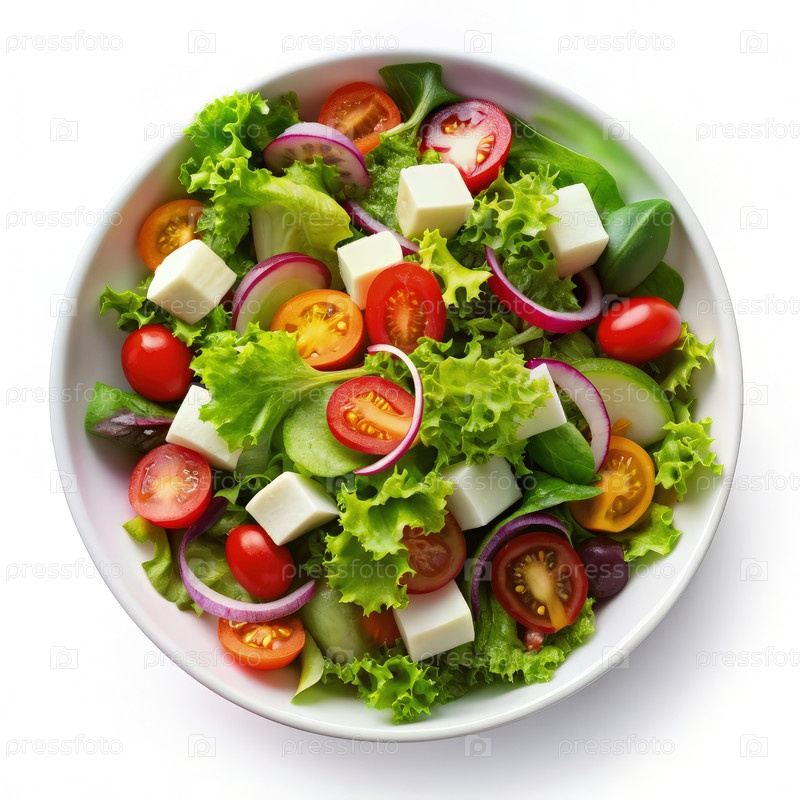 Свежий зеленый салат с томатами, сыром фета и красным луком в белой чашке