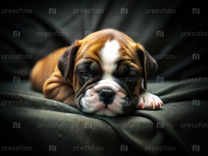 Новорожденный боксерский щенк удобно расположен на мягкой ткани в уютной поместной обстановке