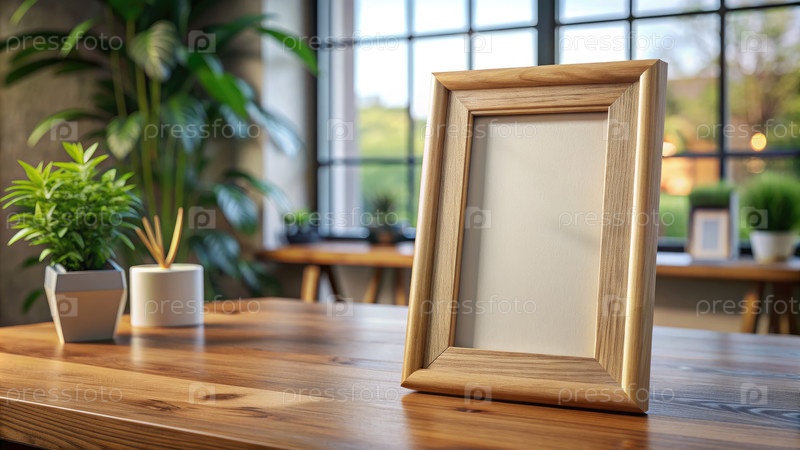 Пустая деревянная картинка на деревянном столе возле окна