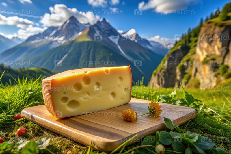 Сыр, отображаемый на деревянной доске с величественными горами в фоне во время солнечного дня