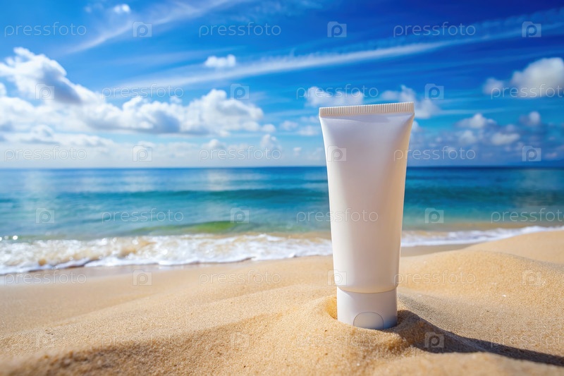 Косметическая кремовая трубка для ухода за кожей расположена на песчаном пляже возле океанских волн под чистым голубым небом