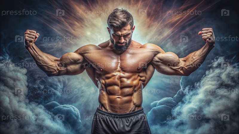 Мускулистый мужчина изгибает бицепсы на драматическом облачном фоне