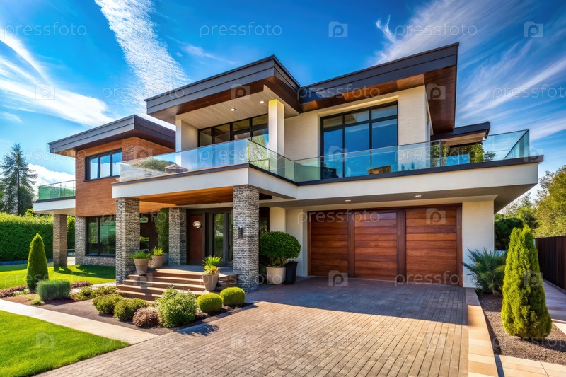 Потрясающий современный роскошный частный дом, окруженный пышной зеленью в яркий солнечный день