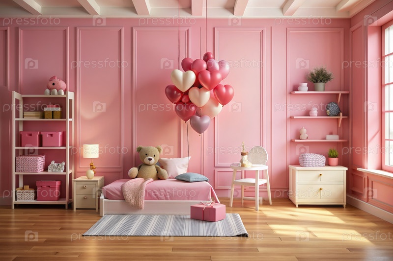 Розовая детская спальня украшена на День святого Валентина с сердечными воздушными шарами