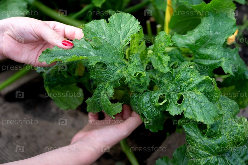 Руки, осматривающие поврежденные листья тыквы в оживленном саду во второй половине дня