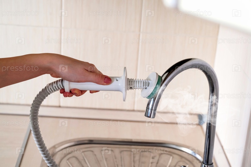 Очистка кухонной поверхности с помощью парового очистителя возле раковины дома