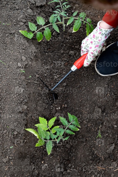 Человек использует небольшой ручной инструмент для выращивания почвы вокруг молодых растений помидоров в садовом клумбе.Это весна, и растения зеленые и свежие