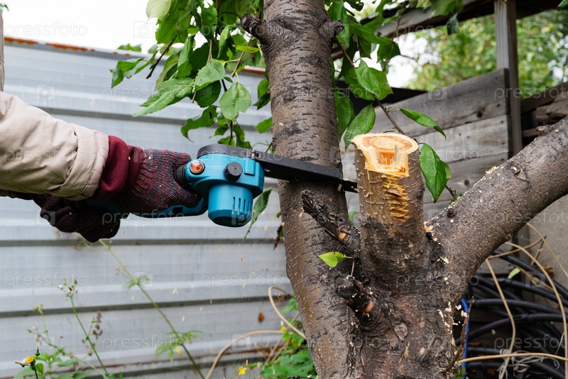 Человек использует бензопилу для садовых работ осенью