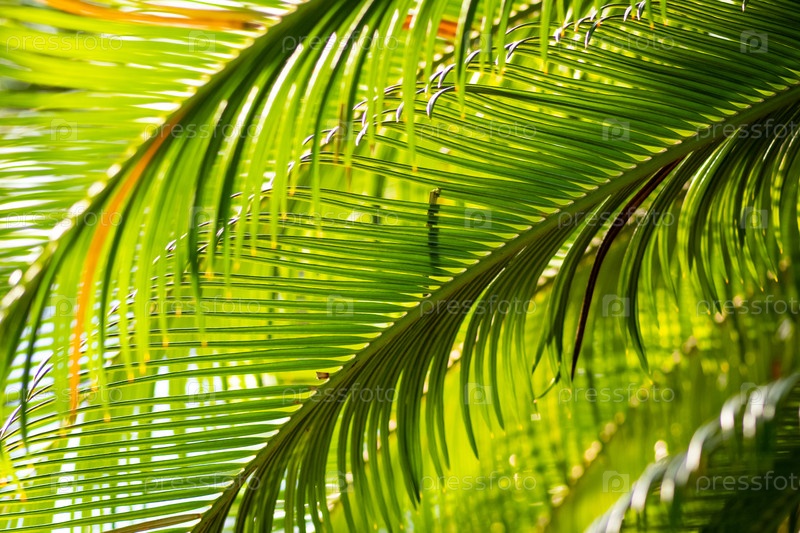 Крупный план ярко-зеленых листьев пальмы с солнечным светом, пробивающимся сквозь листву — тропический ботанический фон