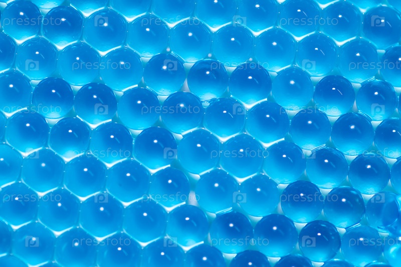 Синие гидрогелевые шарики лежат ровным слоем на белом фоне, образуя узор, напоминающий шестигранные соты