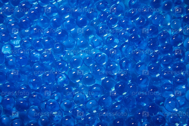 Крупный план множества маленьких синих гидрогелевых шариков, наполненных водой. Шары лежат плотным, однородным слоем, похожие на причудливую синюю икру