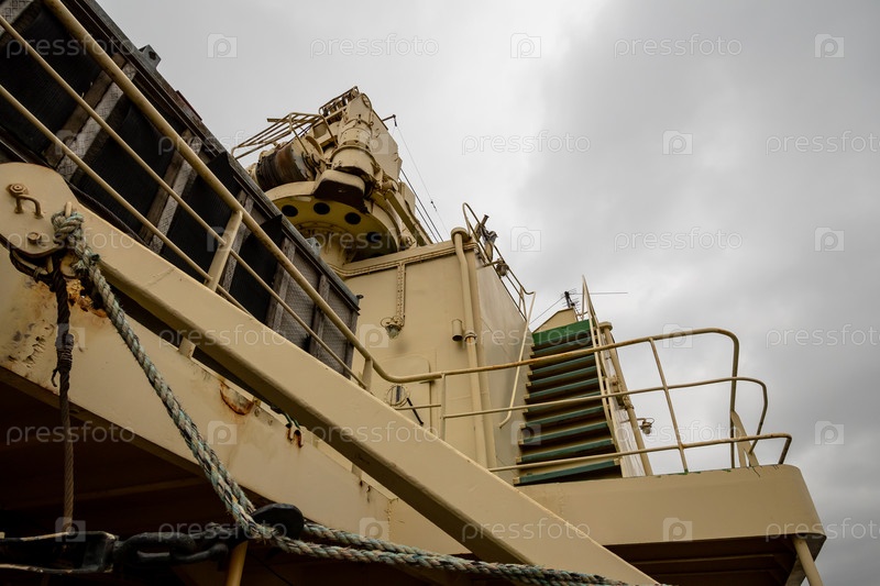 Вид снизу на надстройку старого русского ледокола под серым пасмурным небом